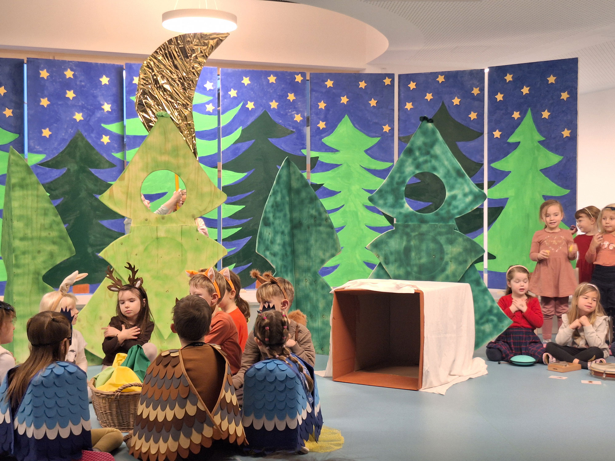 Die Vorschulkinder luden unter der Leitung von Nathalie Ehrl die Familien zu einem Krippenspiel ein. Die Besucher wurden in den Wald entführt, wo sich der kleine Fuchs auf die Suche nach dem Christkind und dem Sinn nach Weihnachten machte. Die kleinen Schauspieler und auch die Kinder die mit den Orffinstrumenten das Orchester und den Chor bildeten, konnten sich über zahlreiche Zuschauer freuen.