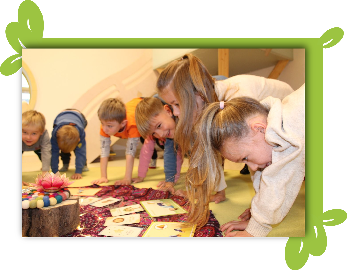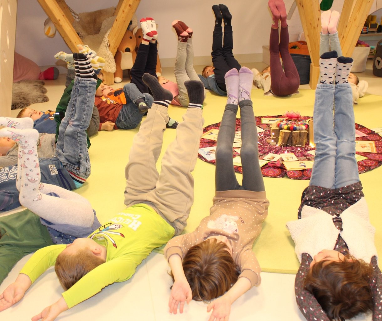 Wir integrieren kindgerechte Yoga-Impulse in den Tagesablauf. Ob im Morgenkreis, als offene Angebote oder einfach nach Lust und Laune zwischendurch. Atemübungen, einfache Bewegungen, stretchen und dehnen, spielerische Achtsamkeitsmomente, Fantasiereisen und Entspannungsübungen. Yoga passt in den Kindergartenalltag.